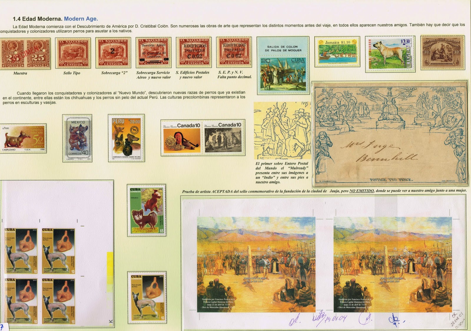 En esta hoja esta un ejemplar del “Mulready”, el primer Entero Postal del mundo, en el cual se puede ver a un perro entre los pies de un indio y una prueba aceptada pero no emitida de Perú.