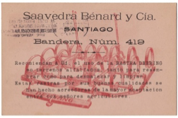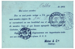 Tarjeta pre-impresa de 2 cts. (fig. 124) enviada de Santiago a Valparaíso el 20 de mayo de 1911, aviso de remate. Posiblemente por no enviar más de 20 tarjetas a la vez, se considera la tarifa de postal nacional en vez de impreso. Posteriormente y a partir del 23 de enero de 1912 estás tarjetas correspondería a la tarifa correcta para enviar pre-impresos.