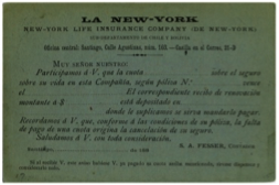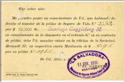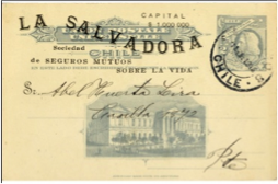 Figura 32Un ejemplo de pre-impresión en éstos enteros es de la Compañía de Seguros de Vida (fig.32), para un formato general con clientes extranjeros a los cuales se enviaría comunicados en cantidades menores a 20 por lo que debería pagar la tarifa de postal internacional de 3 cts., éste mismo pre impreso lo encontramos en tarjetas de uno y dos centavos, para a las tarifas nacionales existentes en esa época.