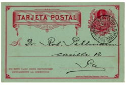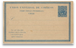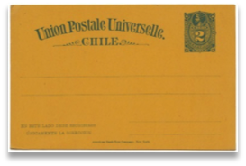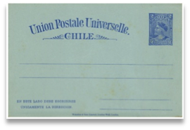 Figuras 12 y 13En consideración a las nuevas tarifas UPU se confeccionan localmente en el año 1881, en la imprenta de Eduardo Cadot de Santiago, tarjetas de 2 ,3 y 4 cts., con las palabras obligatorias "UNION UNIVERSAL DE CORREOS", "UNION POSTALE UNIVERSELLE" en francés y su traducción al español y las indicaciones del modo de escribirlas. Estas tarjetas contemplaban las tarifas de 2 cts. para el envío de material impreso internacional (fig.12); 3 cts. para el de una tarjeta postal internacional por cualquier ruta distinta de Panamá o para envío de material impreso por la vía de Panamá (fig.13), así como la de 4 cts. para el envío de una tarjeta postal por la vía de Panamá (fig.14), contemplando de ésta manera todos los franqueos internacionales reducidos y permitidos por la UPU.
