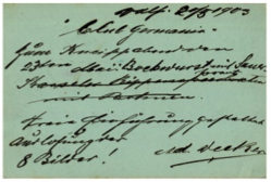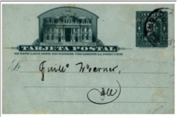 Figura 43En estas tarjetas de 2 cts. también encontraremos su correcta aplicación, y entidades que hicieron uso constante de la tarifa reducida para pre-impresos, como el Club Alemán, estaban en pleno conocimiento que se las tarjetas con pre impresos se despachaban en cantidades menores a 20 unidades deberían pagar 2 cts. Por lo que por lo general se imprimían las invitaciones en tarjetas de ambos valores (fig.43).