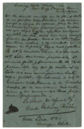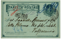 Figura 18Las excepciones a las reglas siempre están presentes y encontraremos tarjetas de un centavo que circularon por el sistema sin que fuera multada, ni en la oficina de recepción ni en la de destino, independientemente si eran de ciudades "importantes" o no. En la fig.19 vemos un ejemplar de Iquique de 1887, que es un claro ejemplo de ello, pues baste ver la extensión del texto para identificar una correspondencia particular, más aún es indudable que de ella no se pudieron enviar 20 ejemplares y menos que ellos hubieren sido iguales.