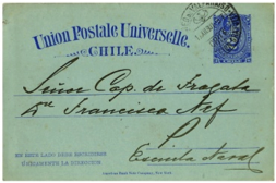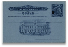Por mandato dado por la Ley del 12 de enero de 1880 al Presidente Aníbal Pinto (1876-1881) y publicada el 29 de enero del mismo año, Chile se adhiere a la Unión Postal Universal el 1º de abril de 1881, en el curso de la Guerra del Pacífico. En concordancia con el Convenio UPU y que 5cff oro correspondían a un centavo de peso chileno, se adoptan las siguientes tarifas para Tarjeta Postal Internacional (a) por la vía de Panamá a países UPU: 10c ff oro más 5c ff oro por el transporte marítimo más 5cff oro por el paso de Panamá, totalizando 20c ff oro o 4 cts. de peso chileno; (b) por cualquier otra vía a países miembros de la UPU, 10c ff oro más 5c ff oro por el transporte marítimo, totalizando 15c ff oro o 3 cts.de peso chileno; y para los envío de Material Impreso Internacional (c) por la vía de Panamá a países UPU: 5cff oro más 5cff oro por el transporte marítimo más 5cff oro por el paso de Panamá, totalizando 15c ff oro o 3 cts. de peso chileno; y (d) por otras vías a países UPU: 5c ff oro más 5c ff oro por el transporte, totalizando 10c ff oro o 2 cts. de peso chileno.