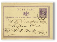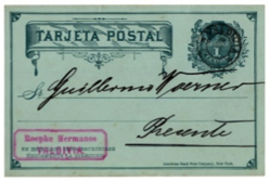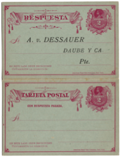 Figura 21La siguiente tarjeta postal con respuesta paga de 2 cts. + 2 cts. de la emisión de 1882 (fig.22), también corresponde a una correcta interpretación de la norma postal previa a la pre-impresión, pues se previsto que si bien el impreso se enviaría en un número superior a 20 unidades, adecuándose a la normativa para material impreso, la utilización de la respuesta pagada por el remitido como respuesta a la invitación, no podría ser enviada por un valor de 1 centavo, pues ella era entregada en la oficina de Correos en una única unidad, debiendo pagar entonces los 2 centavos correspondiente a una tarjeta postal.
