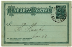 Figura 20Otros dos ejemplos muy interesantes de la aplicación y entendimiento correcto de la norma para Materia Impreso fue el uso de los siguientes enteros postales de la emisión de 1882 y que no estaban destinados a la utilización de "pre-impresiones" particulares. El siguiente es una tarjeta entero postal de 2 cts. (fig.21) a la que se le imprimió un saludo de año nuevo de 1884, pero seguramente la persona habrá pensado que le sería imposible entregarlos en la oficina de Correos en una cantidad mayor a 20 unidades, por lo que se le considerarían como tarjetas postales y no como impresos debiendo pagar los 2 cts. correspondientes.