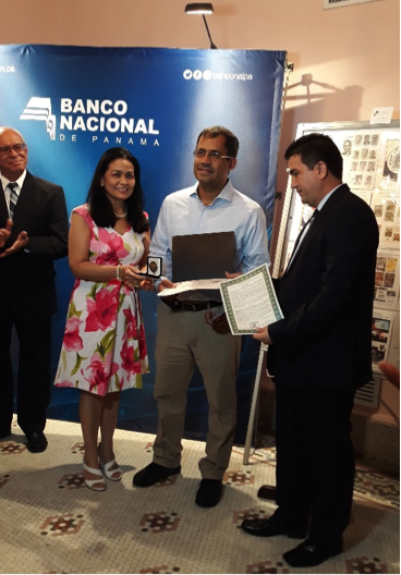 El doctor Ernesto Arosemena Newman recibe la medalla N°1/100 en bronce y aleación, certificado como Miembro Honorario y copia de la resolución en reconocimiento a una labor en pro de la filatelia panameña digna de destacar, felicitar y emular. Don Ernesto Arosemena fue presidente de la Asociación durante el período de 1990 a 2015.